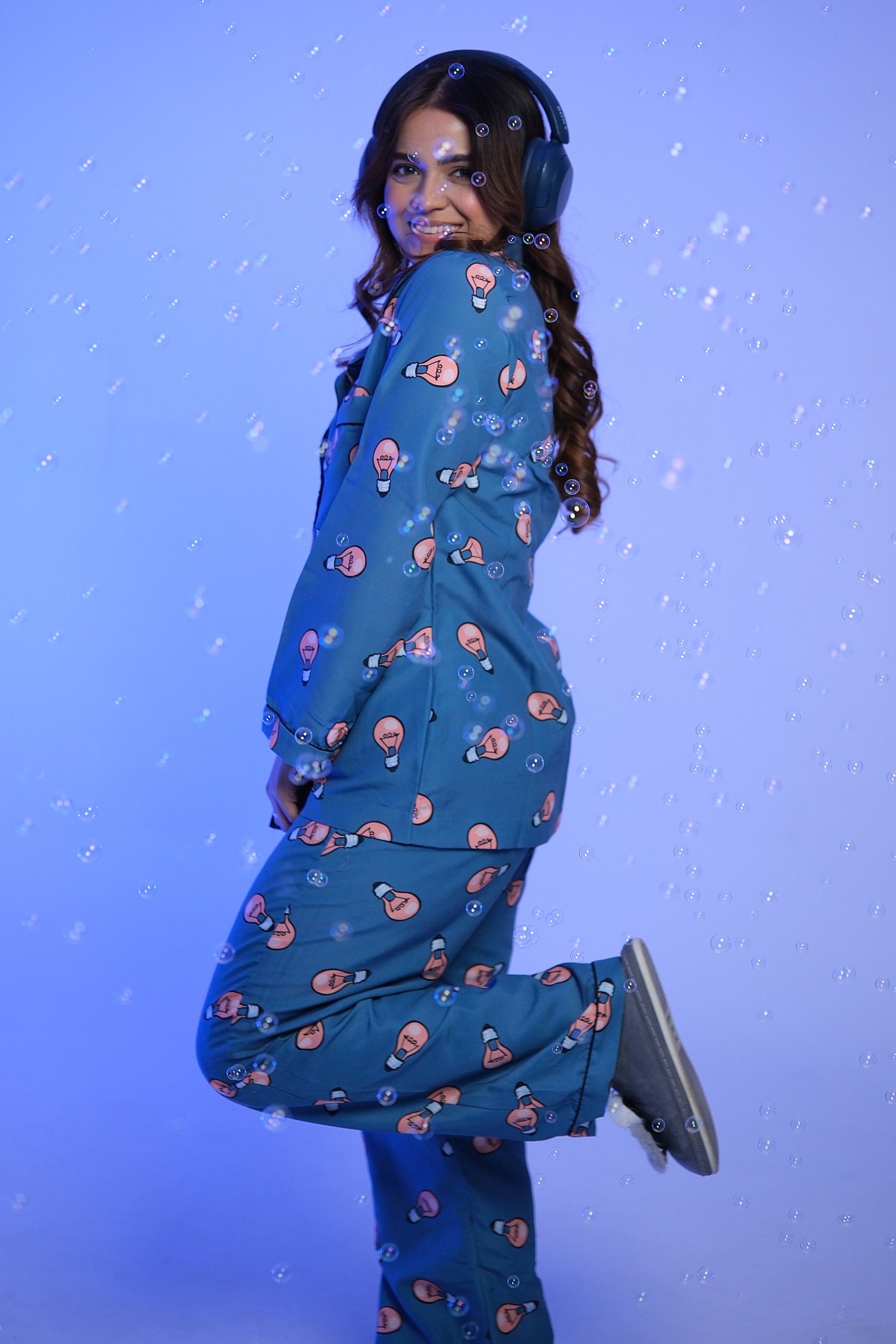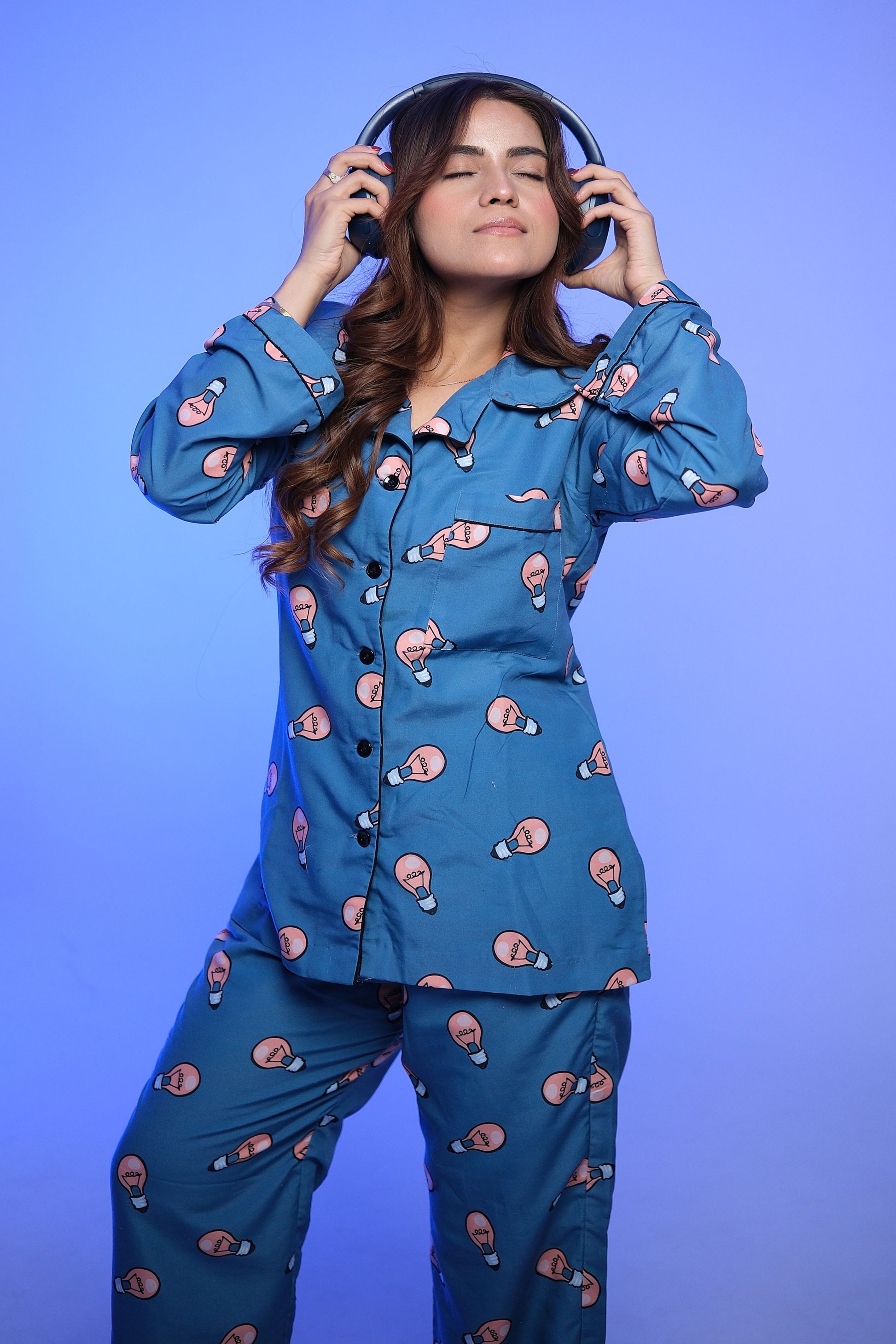 Turn your lounge and bedtime into a creative escape with our Light Up the Night – PJ Lounge Set. This soft, breathable crepe cotton night set in a deep blue hue is sprinkled with playful light bulb prints that bring a quirky twist to your loungewear. The button-down shirt and relaxed-fit pants are designed for all-night comfort, making it perfect for cozy Netflix marathons, reading in bed, or just sparking a few genius ideas before you drift off to sleep.