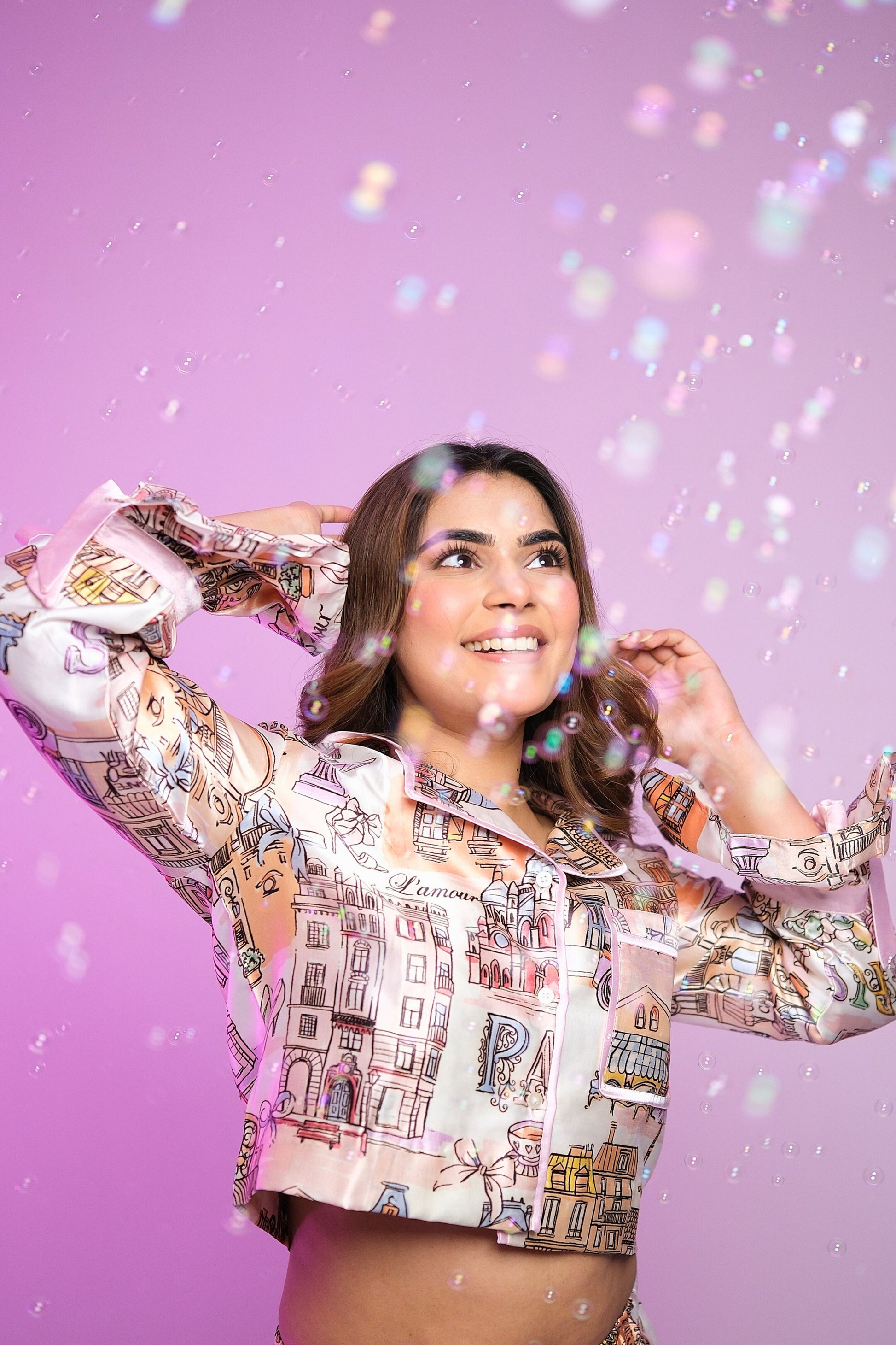 Wake up in the city of love — without leaving your bedroom. The Bonjour in Paris – PJ Lounge Set is a whimsical ode to Parisian charm, featuring hand-drawn cityscape prints of the Eiffel Tower, cobblestone streets, and romantic architecture in a pastel palette. Crafted from a buttery-soft fabric, the top boasts playful bell sleeves with delicate bow accents, adding a touch of feminine flair. The matching pajama pants promise comfort and ease, making it perfect for leisurely mornings, cozy nights, or simply daydreaming about your next Paris getaway.